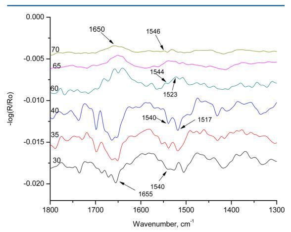 圖8顯示了HI-Langmuir單層在10 mN m處的p極化 ? 1在30、35、40、60、65和70°的六個不同角度。 在布儒斯特角之前,30、35和40 mN/m處的角未顯示出β片的特征帶。 所有三個角度顯示1655和1540厘米處的條紋 ? 1分別對應于酰胺I和酰胺II吸收。 這條帶子在1517厘米處 ? 1,對應于α-螺旋,在35°和40°中存在。 在布儒斯特角之后,所有60、65和70°的三個角都顯示出介于1650和1655之間的帶,這對應于α-螺旋中的酰胺I吸收。 當角度為60°時,在1523 cm處可以看到峰值 ? 1,對應于β片。 光譜中的其他譜帶都不是α-螺旋或β-片的特征。 光譜表明HI在空氣中以α-螺旋的形式存在 ? 水界面。 在10 mN m的恒定壓力下,隨著角度的增加 ? 1,發現光譜中的α-螺旋特征減少。