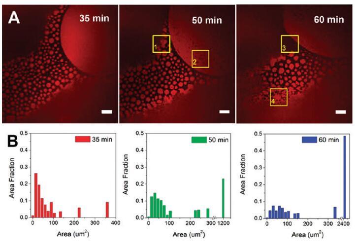 圖5。蛋白質島隨時間的聚合。(A)導入后35、50和60分鐘拍攝的共焦熒光圖像。比例尺:20μm.(B)蛋白質島大小分布的直方圖。初始亞期濃度為[HSA-TR]=0.50 mg/mL和[F-127]=0.015 mg/mL。ROI-1表示一個區域(黃色框),其中小的蛋白質島與周圍的蛋白質島結合形成一個較大的島;ROI-2表明該區域形成了小黑洞;ROI-3表示在表面活性劑富集區域的邊界處的運動;ROI-4顯示了小的蛋白質島合并成網狀網絡的地方。