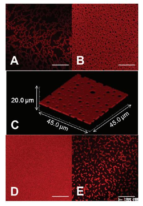圖2。蛋白質組裝的形態,隨離子強度和還原劑的添加而變化。HSATR(0.01 mg/mL)在(A,B)PBS中的AWI下自組裝,pH值7.2,離子強度=53 mM和(C)在掃描體積為45.0*45.0*20.0μm3的情況下,呈現了與圖像B相同的溶液條件對應的共焦圖像Z疊層。(D)PBS,pH值7.2,離子強度=530 mM。(E)30 mM DTT,pH 7.2,離子強度=53 mM的PBS。比例尺:20μm。