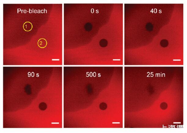 圖4。界面層光漂白后的熒光恢復。ROI(黃色圓圈)是選定的光漂白區域。ROI-1位于富含表面活性劑的區域,而ROI-2位于富含HSA TR的區域。初始亞相濃度為[HSA-TR]=0.10 mg/mL和[F-127]=0.0050 mg/mL。比例尺:20μm。