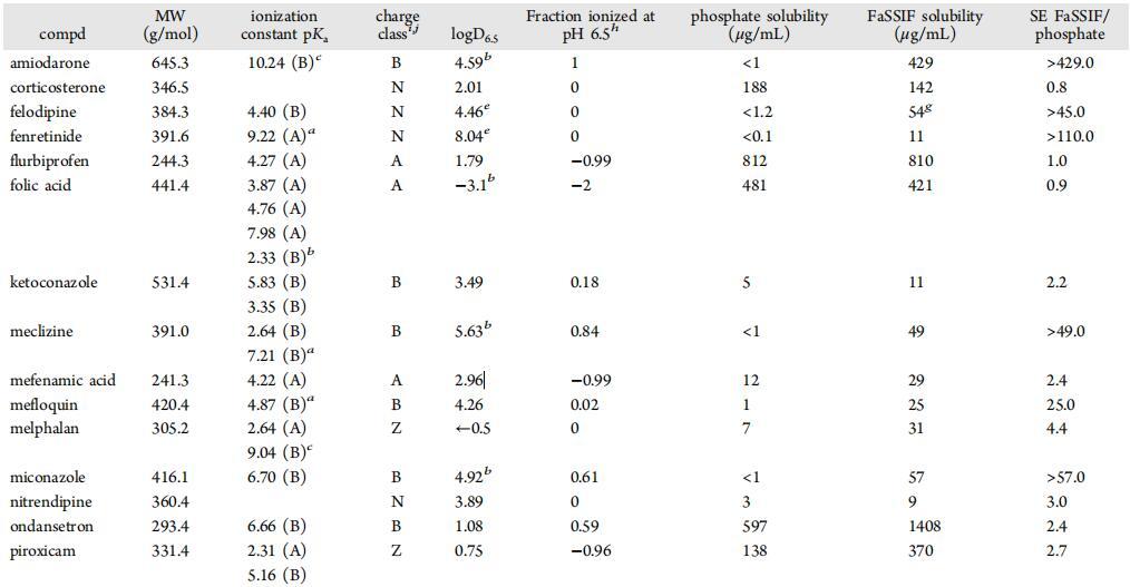 在FaSSIF和水性緩沖液中的溶解度評(píng)估和物理化學(xué)特性。選擇了一組21種上市藥物和30種來(lái)自不同研究項(xiàng)目的羅氏化合物,因?yàn)樗鼈冊(cè)趐H值為6.5的水性緩沖液和FaSSIF介質(zhì)中的溶解度不同。作為標(biāo)準(zhǔn)做法,所有溶解度和表面壓力剖面測(cè)量均在室溫下進(jìn)行,而不是在37°C下進(jìn)行。盡管溫度可能會(huì)影響藥物溶解度、脂質(zhì)聚集體分配和溶解,據(jù)報(bào)道,牛磺膽酸膠束的聚集數(shù)對(duì)溫度變化相對(duì)不敏感。19該化合物組包含不同的化學(xué)性質(zhì)、廣泛的親脂性,并涵蓋不同類型和程度的電荷狀態(tài),包括中性、酸性、堿性和兩性離子分子。表1列出了主要理化性質(zhì)和溶解度數(shù)據(jù)。