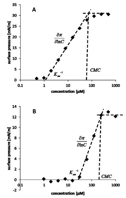 表面活性參數(shù)的測(cè)定。表面活性劑的主要參數(shù)由濃度-表面壓力曲線獲得。圖3中描述了代表性化合物的這些參數(shù),表2中總結(jié)了完整的數(shù)據(jù)集。