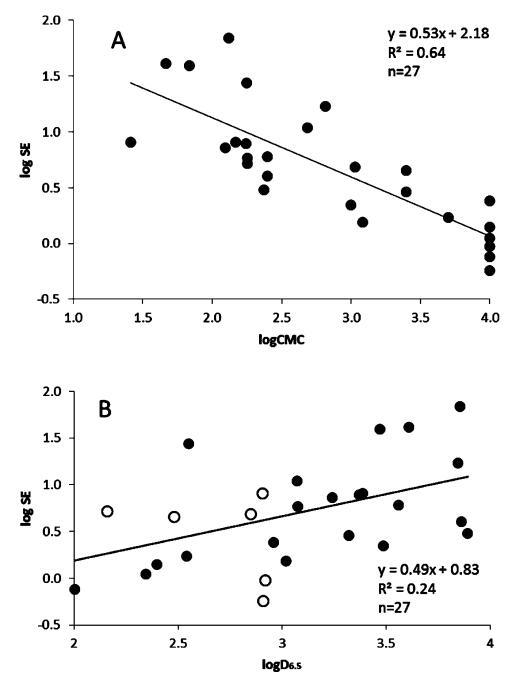 圖5。根據(jù)對(duì)數(shù)CMC(μM,A)和pH 6.5下的辛醇分配系數(shù)(logD6.5;B)繪制溶解度增強(qiáng)曲線。數(shù)據(jù)集僅限于顯示logD6的化合物。5個(gè)在2到4之間。圖B中的開放圓對(duì)應(yīng)于從文獻(xiàn)檢索、預(yù)測(cè)或從pH值為7.4的logD推斷的logD值。高于或低于檢測(cè)限的值在檢測(cè)限處繪制。