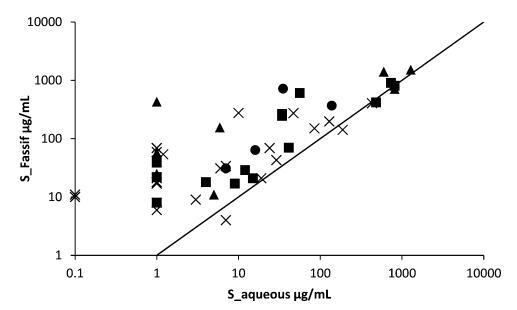 圖1。測(cè)定了51種化合物在磷酸鹽和FaSSIF緩沖液中pH值為6.5時(shí)的平衡溶解度。化合物被歸類為酸(■),基地(▲),中性(×)和兩性離子(●).線對(duì)應(yīng)于單位線。低于檢測(cè)限的值在檢測(cè)限處繪制。