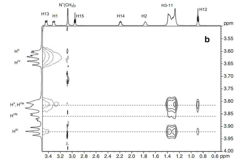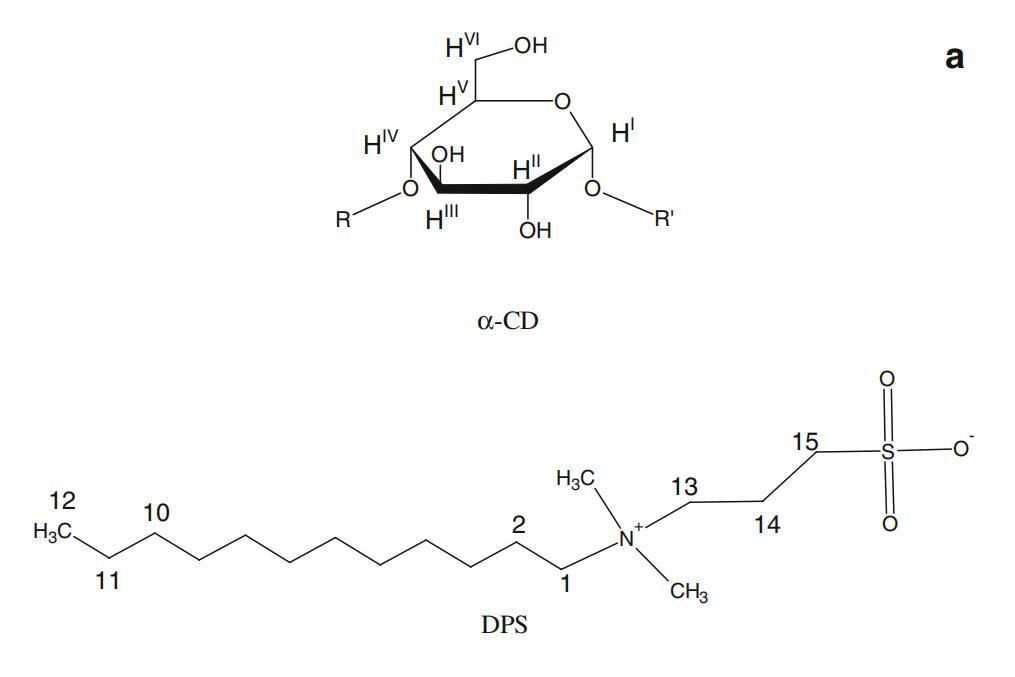 圖7a顯示了α-CD、DPS和Mega-10的示意圖,以簡化表面活性劑原子與CD原子的相互作用。2DROESY數據證明表面活性劑的烷基鏈包含在α-環糊精的疏水腔中。光譜如圖7b和c所示。可以看到表面活性劑共振與位于環糊精空腔內的HIII、HV和HVI共振的交叉峰。未觀察到分子(HI、HII和HIV)外部與環糊精原子的相互作用。對于這兩種表面活性劑,與HIII和HV的相互作用似乎覆蓋了從末端甲基到H3的整個烷基鏈。這意味著幾個不同的復雜幾何形狀和穿透深度之間的快速交換。在鎘原子和親水性頭基之間沒有觀察到相互作用。