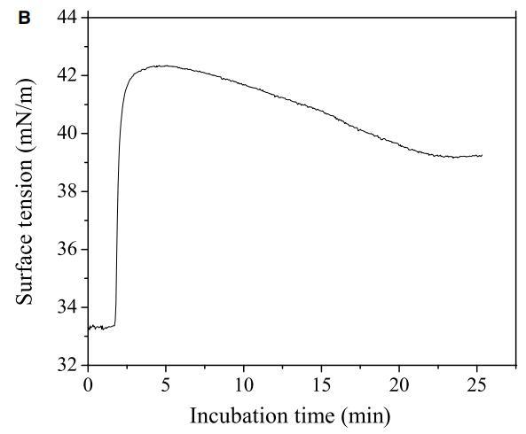 圖5:(A)使用活/死試劑盒測定的肽CL-7誘導A549細胞膜損傷的動力學。在不同時間點添加肽溶液后拍攝熒光圖像。計算綠色像素占總綠色和紅色像素的百分比,以估計細胞膜的完整性。(B)肽CL-7結合和插入引起脂質單層的表面張力變化(DPPC/膽固醇/DPPS=50/10/2.5)。肽濃度保持在10 lM,脂質單層的初始表面張力設定為33 mN/m。