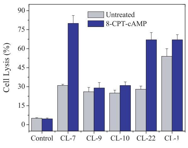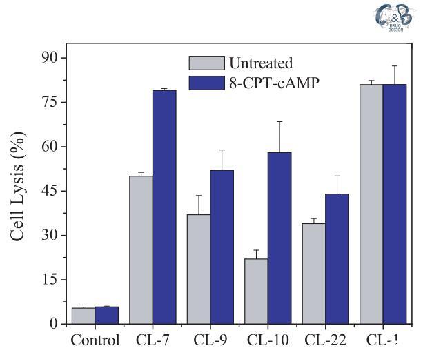 為了排除上述結果由CHO-K1細胞的某些固有特性引起的可能性,我們在另一個選定的細胞A549上進行了相同的實驗,其細胞表面電荷與CHOK1細胞幾乎相同(表1)。由于肽將受到來自A549和CHO-K1細胞的相同拉力,靜電吸引對肽-細胞相互作用的潛在影響被最小化或消除。A549細胞的表面pH值為7.15,高于肽CL-9、CL-10和CL-22的過渡pH值,但低于肽CL-7的過渡pH值(pH值為7.35)。同樣,CL-7被證明是A549細胞上最活躍的肽(圖3)。在存在8-CPT-cAMP的情況下,A549細胞的表面pH值降低至pH=6.55(表3),低于所有受試裂解肽的過渡pH值(表1)。因此,四種pH敏感裂解肽對8-CPTcAMP處理的A549細胞的裂解活性顯著增加(圖3)。應注意的是,與pH敏感肽不同,當細胞被8-CPT-cAMP處理時,pH不敏感肽CL-1對A549和CHO-K1細胞的活性幾乎沒有變化(圖2和圖3)。