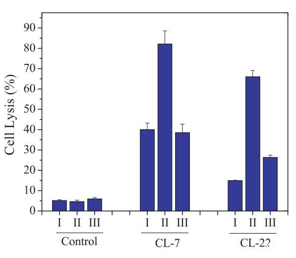 圖4:在CHO-K1細胞(I)、用8-CPT-cAMP處理的CHO-K1細胞(II)和用8-CPT-cAMP處理的CHO-K1細胞上測試的細胞表面pHs調節PH敏感裂解肽CL-7和CL-22的細胞裂解活性,然后是巴絲霉素A1(III)。表3提供了不同處理對應的細胞表面pHs。在所有實驗中,肽濃度固定在40 lM。對照組未添加肽。對照空白對照組和100%裂解對照組,將細胞裂解(乳酸脫氫酶釋放)標準化為細胞死亡百分比。數據代表至少三個獨立測試的平均值和標準差。