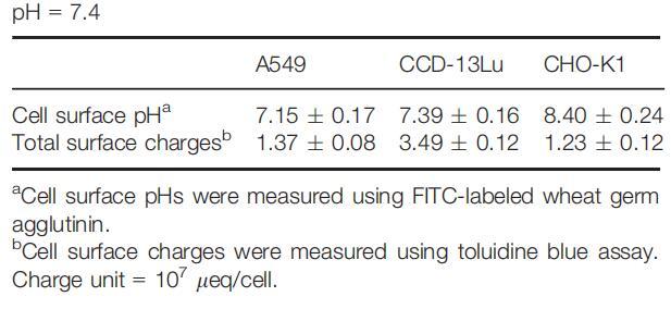 雖然細胞外環境通過影響細胞表面和整體溶液之間的質子交換而影響細胞表面pH值,但在pH值固定的生理條件下,細胞表面pH值將由細胞的化學和生物學特性決定,包括細胞的質子生產能力、細胞大小、細胞的大小、細胞的大小、細胞的大小、細胞的大小、細胞的大小、細胞的大小、細胞的大小、細胞的大小以及細胞的大小,以及細胞表面的pH緩沖能力。因此,在生理條件下,組織細胞可能具有特定的甚至可區分的表面pHs。我們測量了一組來自不同器官/組織的細胞在生理pH下的細胞表面pH值,發現所有受試細胞都具有不同的表面pH值(表1)。