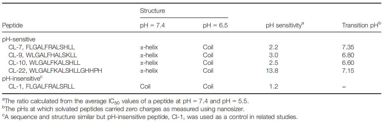 肽CL-1是一種pH不敏感的裂解肽(表2)。盡管其序列和結構與其他pH敏感肽相似,但其細胞裂解活性幾乎不受pH的影響。本研究以肽CL-1作為陰性對照。