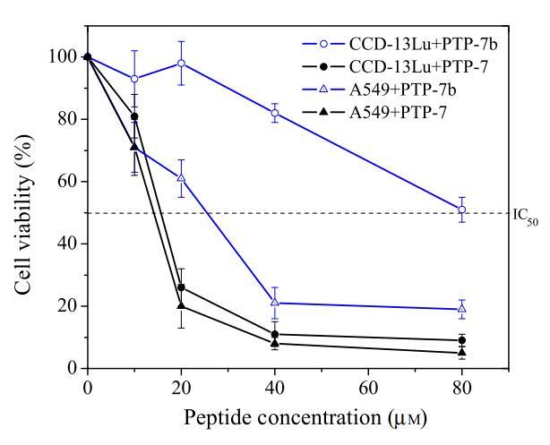圖8:pH敏感肽PTP-7b(FLGALFKALSHLL)對正常-癌細胞對CCD-13Lu和A549細胞的細胞毒性(MTT試驗)。以pH不敏感肽PTP-7(FLGALFKALSKLL)作為對照。數據代表至少三個獨立測試的平均值和標準差。