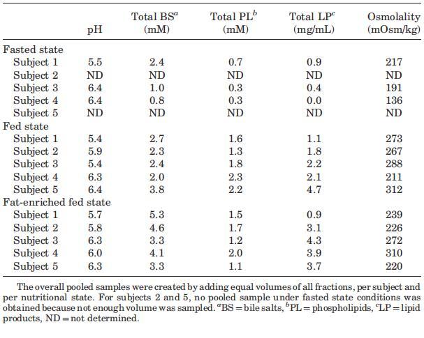 在本篇文章中,人類十二指腸內容物在進食后的一段時間內就幾種不同的腸道參數進行了表征,包括pH值、脂解產物、膽鹽、磷脂、滲透壓和表面張力。據我們所知,之前從未進行過攝入不同營養成分膳食后十二指腸液的受試者內表征。由于研究方案可能在多個方面有所不同,并且由于不同類型的試驗餐在整個文獻的不同研究中使用,結果的比較并不總是簡單的。上述結果清楚地說明了所有檢查的腔內參數在個體之間的高度可變性。此外,這些參數隨時間變化的波動增加了復雜性。因此,不能假設管腔內成分隨時間的具體趨勢。這意味著餐后腸道內容物的特征不容易在每個參數的單個值或時間曲線中呈現;主體內和/或主體間變化的重要性不會被提出。數據表明,通過報告單一代表性值,可變性將被掩蓋;匯集的HIF樣本以及計算的中隔的腔內參數值通常與文獻中報告的典型值一致,這一事實證實了這一點。作為一個實際的折衷方案,最近有人提議使用三種不同的模擬腸液來表示餐后腸道環境。40腔內參數值的變化可能是一組因素的結果,包括可變的胃排空、沿胃腸道的擴散、同時進行的消化和吸收以及不均勻分布的腸道內容物。腸道液體可能分布到水袋28是最近的觀察結果,需要進一步研究。鑒于本研究中觀察到的變異性,可以建議增加志愿者人數。然而,估計用于檢測研究中每個物理化學參數存在差異的最小受試者人數并不容易,因為可變性水平隨參數而變化。