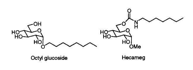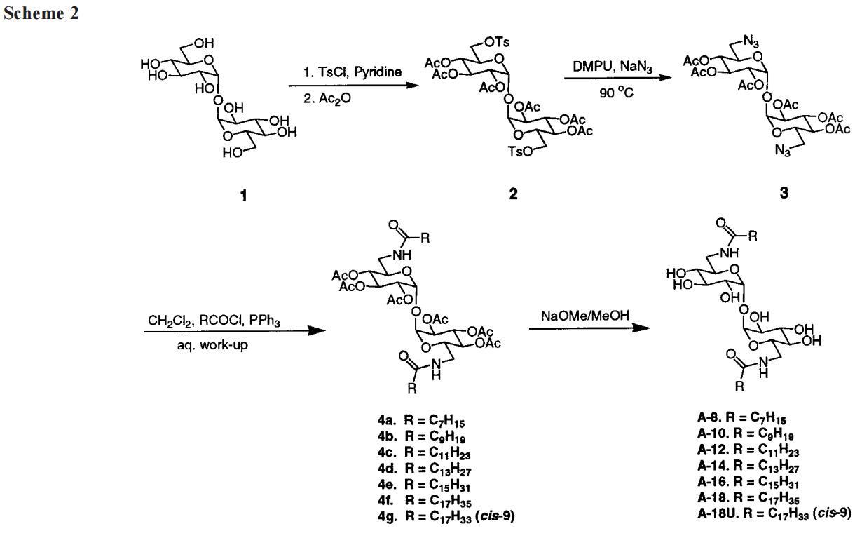 我們的第一個(gè)驚喜是發(fā)現(xiàn)A系列海藻糖雙子座不溶于水。例如,A-12、A-14和A-16(指鏈長的數(shù)字)在1毫升溫水中旋轉(zhuǎn)2毫克時(shí)會(huì)留下沉淀物。即使在70°C的溫度下,A-10也會(huì)在這種處理過程中形成渾濁的懸浮液。A-8在室溫下的可溶濃度僅為1-2 mM(根據(jù)動(dòng)態(tài)光散射,在該濃度下,會(huì)形成膠束大小的聚集體)。天真地說,人們可能會(huì)認(rèn)為a-8的溶解度大得多,因?yàn)樵摲肿佑闪鶄€(gè)羥基和兩個(gè)酰胺組成。盡管相關(guān)的6-氨基-6-脫氧己糖衍生物需要加熱才能溶解,25許多烷基化單糖(例如,辛基葡萄糖苷和甲基6-O-(N-庚基羰基)-R-D-吡喃葡萄糖苷或下面的“Hecameg”)是水溶性的。然而,A-8并沒有類似的天賦。這里的教訓(xùn)是,用一句老生常談的話來說,我們的雙子座比其各個(gè)部分的總和要多(或少)。不管老生常談與否,雙子座的獨(dú)特屬性都取決于它。