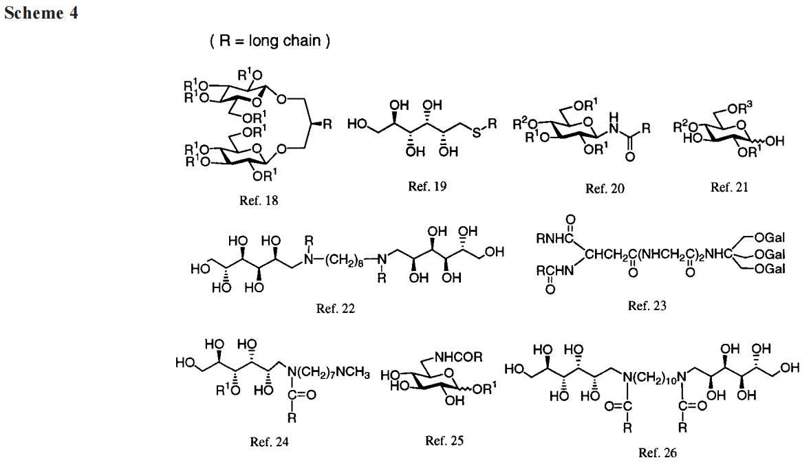 迄今為止的總結(jié)是:A系列海藻糖雙子,對于10或更長的鏈不溶于水,形成單分子膜,其界面區(qū)域主要由糖間隔基控制。分子間的鏈/鏈相互作用穩(wěn)定了薄膜。A-8在水中形成小膠束,而水合后,更高的同系物聚集成泡狀和管狀結(jié)構(gòu),在光學(xué)顯微鏡下可見。水化性質(zhì)與凝膠到液晶的轉(zhuǎn)變相一致,事實(shí)上,轉(zhuǎn)變溫度可以通過量熱法確定。因此,海藻糖雙子的行為與磷脂和合成雙鏈表面活性劑的行為相似。17,37就好像海藻糖不是雙子座的間隔物,而是一個(gè)特別大但傳統(tǒng)的頭群。