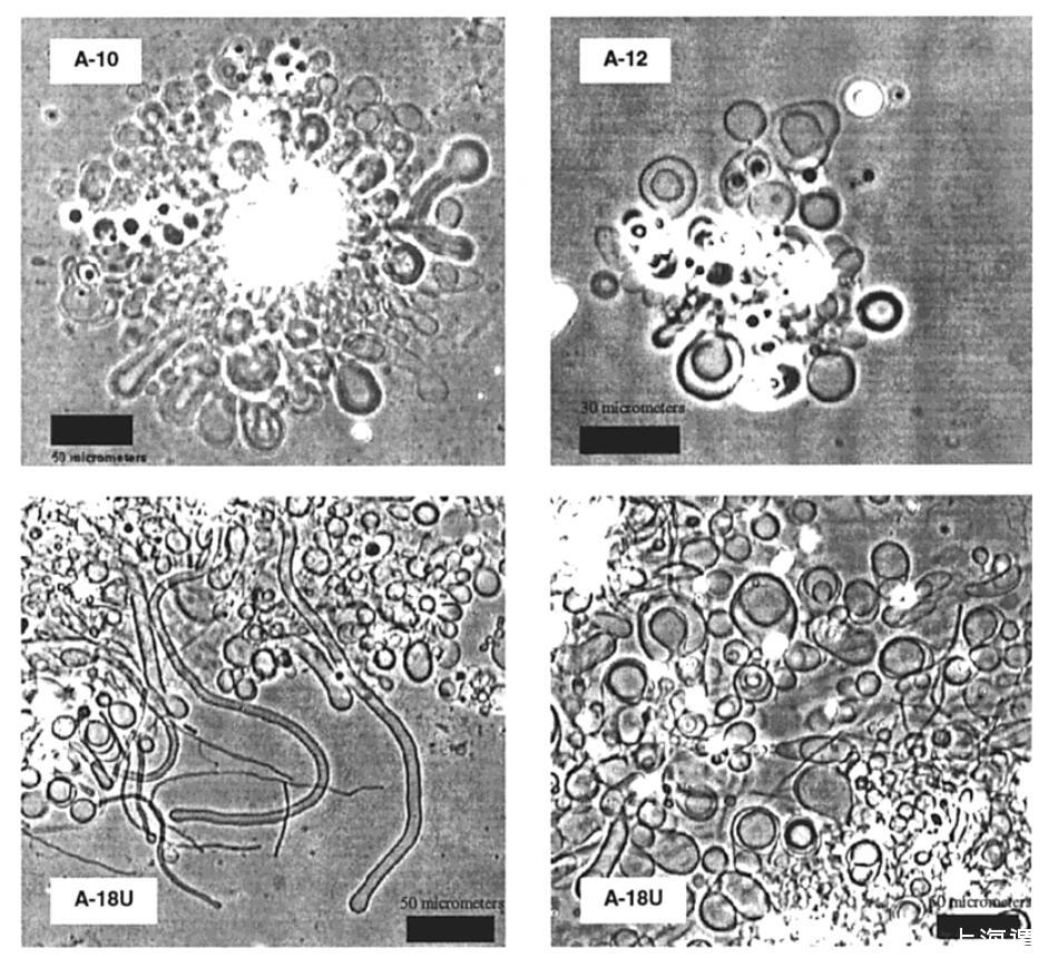 圖2。A-10(左上)、A-12(右上)和A-18U(下)在23°C下水合3-4小時(shí)后形成的囊泡和管狀結(jié)構(gòu)的相襯顯微照片。在45°C下培養(yǎng)的A-14和A-16樣品中觀察到類似結(jié)構(gòu)。