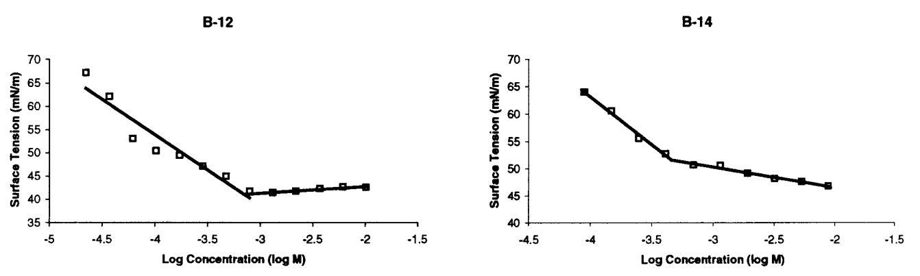 圖4。室溫下測定B-12和B-14臨界膠束濃度的張力測定圖。B-14混合后立即進(jìn)行測量,而B-12樣品老化20分鐘。