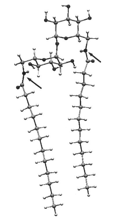 計(jì)算首先將海藻糖插入宏模型程序42,并對結(jié)構(gòu)進(jìn)行琥珀色能量最小化。從使用琥珀色*力場的25000個(gè)構(gòu)象搜索中,我們選擇了能量最低的構(gòu)象,該構(gòu)象恰好與報(bào)告的X射線結(jié)構(gòu)重疊。43,44接下來,該結(jié)構(gòu)中的6-和6′-羥基被乙酰氨基取代。在模擬的水環(huán)境中,用AMBER*再次進(jìn)行了25000次構(gòu)象搜索。然后乙酰基被十二烷基取代,然后對生成的a-12雙子座進(jìn)行了另一次搜索。結(jié)果表明,整個(gè)構(gòu)象由酰胺羰基和相鄰葡萄糖環(huán)的2-羥基之間的兩個(gè)分子內(nèi)氫鍵控制。氫鍵導(dǎo)致兩條全反式鏈彼此擺動(dòng)約95°。A-12的固態(tài)紅外光譜證實(shí)了這種相互作用,該光譜顯示1646 cm-1處有羰基帶,而Hecameg的羰基帶為1700 cm-1,單體葡萄糖類似物的羰基帶為1698 cm-1。25由于這種構(gòu)象會(huì)不切實(shí)際地排除分子內(nèi)疏水締合,而且在任何情況下,羰基氫鍵位點(diǎn)的溶劑可能會(huì)淹沒在水中,我們故意不允許-CdO氫鍵,并重新計(jì)算。通過這種方式,我們得到了圖6。可以看到,一條鏈上大約有八個(gè)碳與其伙伴鏈的碳并排排列。N/N距離僅為7.4?,整體分子形狀為“管狀”。用另一種方式說,糖的頭基延伸的距離不比兩條鏈的寬度大多少,就像人們預(yù)期的一種易于堆積成雙層的化合物那樣。45因此,正如前面從實(shí)驗(yàn)數(shù)據(jù)得出的結(jié)論,海藻糖更像是一個(gè)統(tǒng)一的頭基,而不是一個(gè)可以有效隔離鏈的長間隔基。