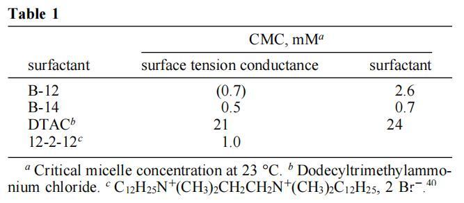 B-12和B-14確實(shí)是水溶性化合物,在臨界膠束濃度(CMC)以上形成膠束,動(dòng)態(tài)光散射顯示顆粒大小小于5nm。CMC值是通過表面張力-濃度曲線(圖4)和電導(dǎo)率-濃度曲線(圖5)中的斷裂來確定的。38表1給出了結(jié)果數(shù)據(jù)(以及兩種常規(guī)表面活性劑的數(shù)據(jù),用于比較)。如圖所示,B-12的CMC值通過張力測量法和電導(dǎo)測量法(這兩種方法都是可重復(fù)的)得出的結(jié)果不一致。這種差異至少部分可以追溯到B-12表面張力的時(shí)間依賴性。因此,在10分鐘的過程中,B-12水溶液的表面壓力增加了10 mN/m,之后趨于穩(wěn)定。這種動(dòng)態(tài)表面張力過程(之前已經(jīng)用雙子座表面活性劑觀察到)13,15,39可能與雙子座表面活性劑在空氣/水界面組織方面的困難有關(guān)。為了解決這個(gè)問題,圖4中的B-12溶液在表面張力測量之前老化20分鐘,從而減少了系統(tǒng)尚未平衡的可能性。盡管采取了這種預(yù)防措施,但我們無法確定依賴時(shí)間的界面重組是否不會(huì)影響B(tài)-12圖,并導(dǎo)致基于張量和電導(dǎo)的數(shù)據(jù)之間的差異。當(dāng)然,后者來源于不受界面事件影響的大塊特性,因此更可靠。有趣的是,B-14沒有表現(xiàn)出隨時(shí)間變化的表面張力,兩種方法確定的CMC值是合理一致的。也許更長的鏈既增強(qiáng)了對空氣/水界面的親和力,也增強(qiáng)了從溶液中吸收界面的動(dòng)力學(xué)。