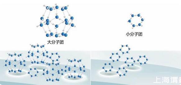 科學家近些年通過研究發現,氣態的水可以假設為單個水分子或者是二聚體水分子;處于液相與氣相過渡狀態的水分子可能會有簡單的三元、四元、五元甚至六元環形分子存在;液相水分子團的結構要大于液相與氣相過渡狀態的水分子,會有六元、七元、八元甚至是更大的分子團存在。當分子簇大于7以后已經不大容易形成單個的環狀分子簇了,即便可以勉強形成大環分子狀態上也十分不穩定,很快便會通過變形轉化成折疊形態或多環結構。與高分子不同的是由于水分子之間并沒有形成共價鍵而是以氫鍵相連,因而這種分子鏈在液態時十分脆弱,應該處于動態下的不斷斷裂和組合過程中。