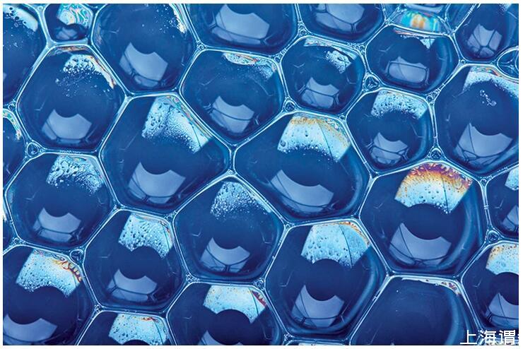 單層的“泡泡筏”由大多數六邊形(不一定是正六邊形)的泡泡組成。有一些“缺陷”泡泡可能有五面或七面。但三邊相交,角度約為120°。圖源:Shebeko/Shutterstock