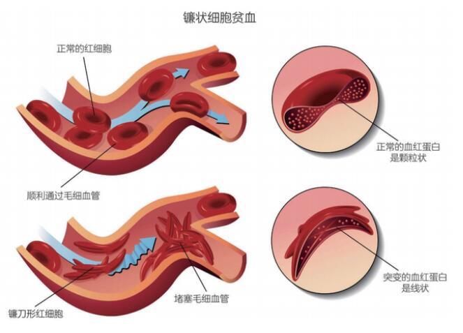 我們的紅細(xì)胞原本是中間略扁的圓餅形,這下卻被又長(zhǎng)又硬的突變血紅蛋白凝聚物撐成了鐮刀形,不但運(yùn)輸氧氣的能力大幅下降,還會(huì)卡在毛細(xì)血管的拐彎處,形成大范圍的栓塞,肝臟、脾臟、紅骨髓等毛細(xì)血管豐富的組織都將受到嚴(yán)重的損傷。所以,那些從父母雙方繼承的基因都有這個(gè)突變的“純合”患者,常常會(huì)有生命危險(xiǎn)。