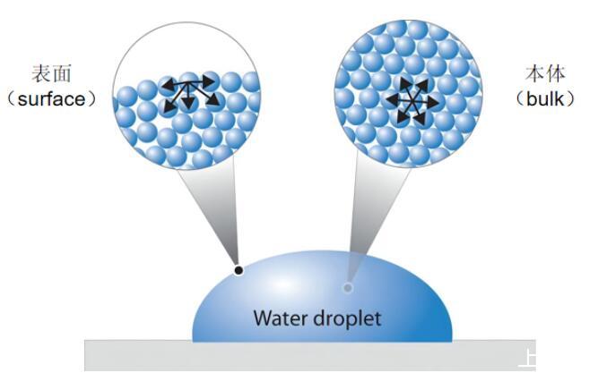 但是,表面的出現,使得一些分子變得不同,它們的外側是氣體或真空,幾乎沒有作用力,這使得表面上的分子“很不安分”,產生了額外的能量——表面能。