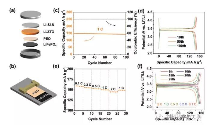 圖5.a,b)全固態(tài)Li-Si-N|LLZTO|PEO-LiFePO4電池的制備和組裝示意圖。