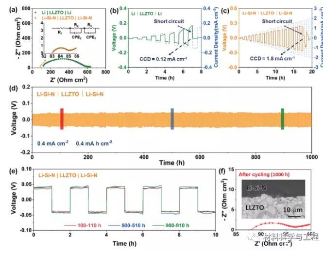 圖4.a)室溫下Li|LLZTO|Li和Li-Si-N|LLZTO|Li-Si-N電池的交流阻抗譜比較。