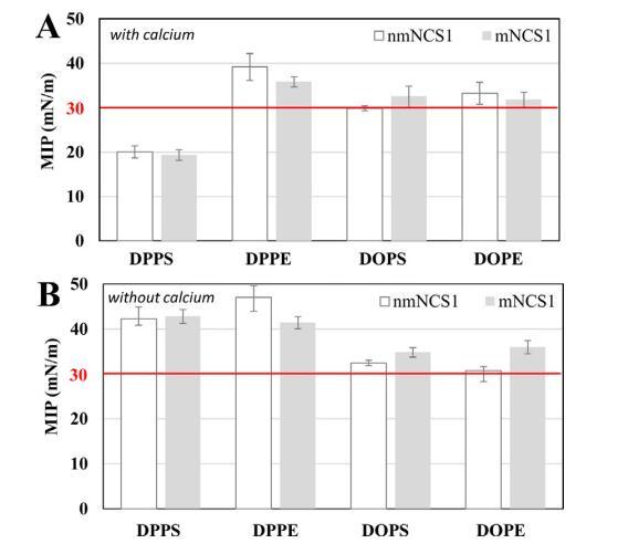 圖6.nmNCS1(白色)和mNCS1(灰色)的MIP值,在不存在鈣(A)和存在鈣(B)的情況下,具有DPPS、DPPE、DOPS和DOPE。MIP值的不確定性如第2.3節(jié)所述計算。