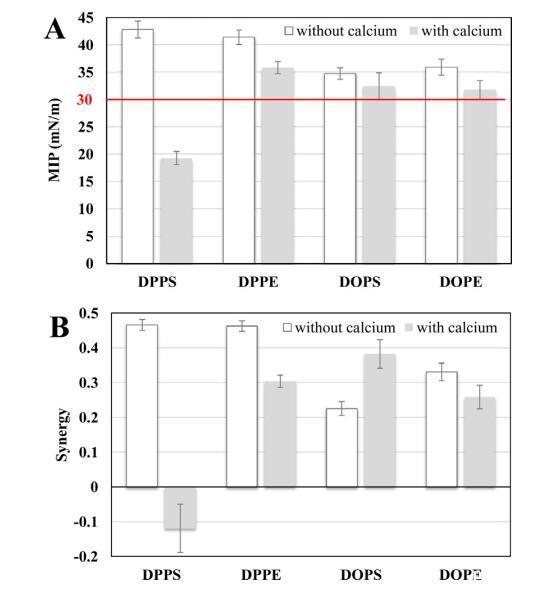 圖7.在鈣存在下,使用DPP、DSP、DOPS、DDPS、DPPC、DSPC、DOPC、DOPC、DDPC、DPPE、DSPE、DOPE、DOPE和DDPE的單層的N-末端肽的MIP(A)和協(xié)同作用(B)值。MIP和synergy值的不確定性如第2.3節(jié)所述計算。