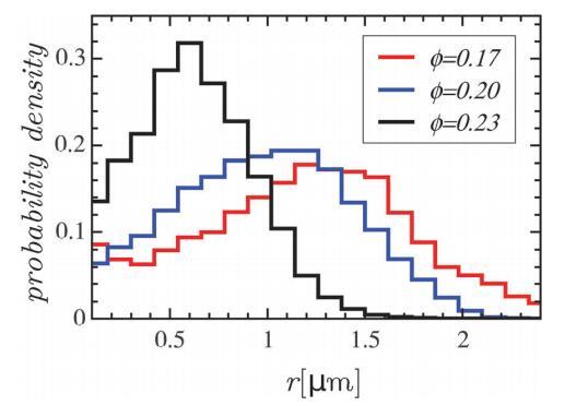 圖4具有不同凝聚面積分數的單分子膜的域半徑分布。