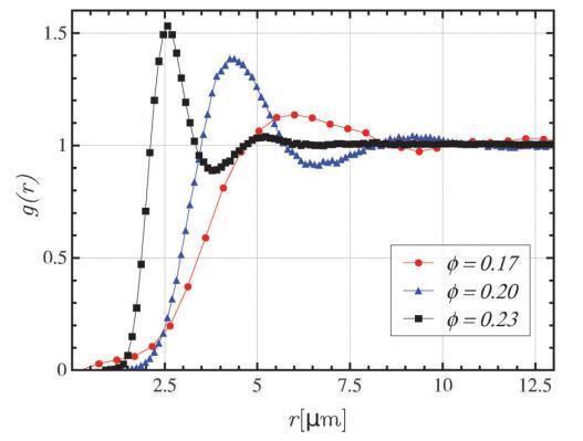 圖5顯示了三個實驗系統的徑向分布函數。在所有情況下,g(r)類似于液體,顯示出明確的第一峰(在rmax處),其表征了第一配位殼層,即最近鄰。此外,對于f=0.20和f=0.23的系統,觀察到與第二配位殼對應的標記的第一最小值和第二最大值。由于“強”排斥作用,最近鄰距離遠大于平均磁疇直徑。因此,硬核斥力不是結構的決定因素,系統的特征長度是平均幾何距離rm=r 1/2。