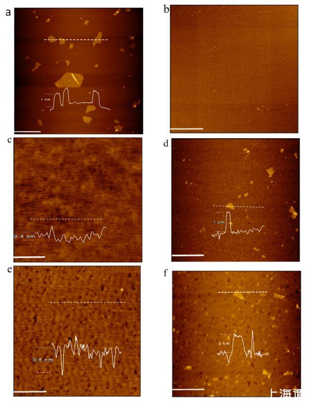 圖5.新切割云母表面上的AFM圖像(比例尺=1μm):(a)干燥后的一滴GO分散液;(b)LB膜在空氣中不沉積脂質(zhì)的對(duì)照實(shí)驗(yàn)?GO-水界面;(c)從空氣中轉(zhuǎn)移的DODAB LB膜?純水界面;(d)從空氣中轉(zhuǎn)移的DODAB LB膜?GO-水界面;(e)從空氣中轉(zhuǎn)移的DSEPC的LB膜?純水界面;(f)從空氣中轉(zhuǎn)移的DSEPC的LB膜?轉(zhuǎn)到水界面。所有脂質(zhì)LB膜在20 mN/m的恒定表面壓力下轉(zhuǎn)移。
