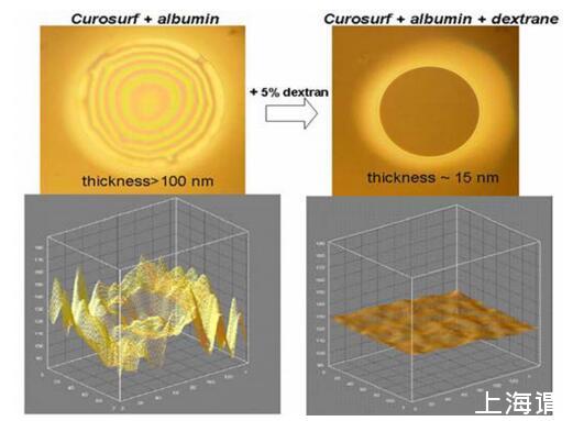 當通過Survanta和白蛋白添加到混合FFs中時,葡聚糖不會改變膜的性質。然而,當FFs中包含PEG 10000時,富含白蛋白的厚膜分解成更小的厚“島”,島之間有薄的(h=17 nm)黑色區域(圖4)