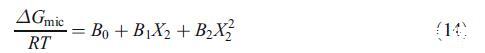 通過使用等式16,可獲得參數B2,隨后可從等式17獲得B1。表2顯示了B0、B1和B2的值。本混合系統報告的B1值為?7.91.B1的大負值表明烴鏈-鏈相互作用對混合膠束的穩定性也起著重要作用。Maeda還報告了不同二元混合物的負和正B1值,并得出結論,鏈-鏈相互作用和頭部基團的空間不相容性是這些變化的原因[21]。根據等式14和表2的參數,我們評估了膠束形成的自由能(數據未顯示)。這些評估值接近從偽相分離模型獲得的值(表1)。