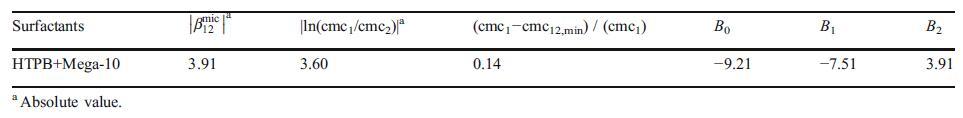 表2膠束中的平均相互作用參數值,bmic 12,ln cmc1=cmc2 je?cmc12,min)/(cmc1),以及根據Maeda方法的HTPB+Mega-10表面活性劑二元混合物的相互作用參數