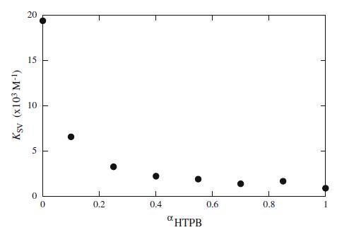 KSV值根據公式20(數據未顯示)的斜率進行評估,如圖6所示。圖6顯示KSV的值隨著HTPB成分含量的增加而降低,反映出熒光團變得更難接近猝滅劑。據報道,隨著陽離子gemini表面活性劑摩爾組成的增加,KSV降低[24]。