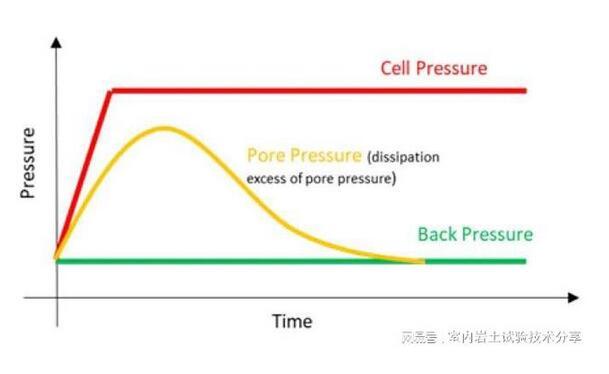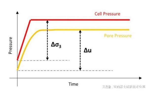 飽和后,試樣通常被固結(jié)到代表其原位條件的應(yīng)力狀態(tài)。固結(jié)通常是各向同性的應(yīng)力-垂直和水平施加給樣品的應(yīng)力相同(σ3=σ1)。然而,固結(jié)也可以是各向異性的,其中σ3≠σ1。在這種情況下,測試通常縮寫為CIU(各向同性固結(jié)不排水)或CAU(各向異性固結(jié)不排水)。試樣固結(jié)通常通過增加圍壓進(jìn)行,同時(shí)保持恒定的反壓(通常等于最終飽和度B檢測期間達(dá)到的孔隙壓力)。