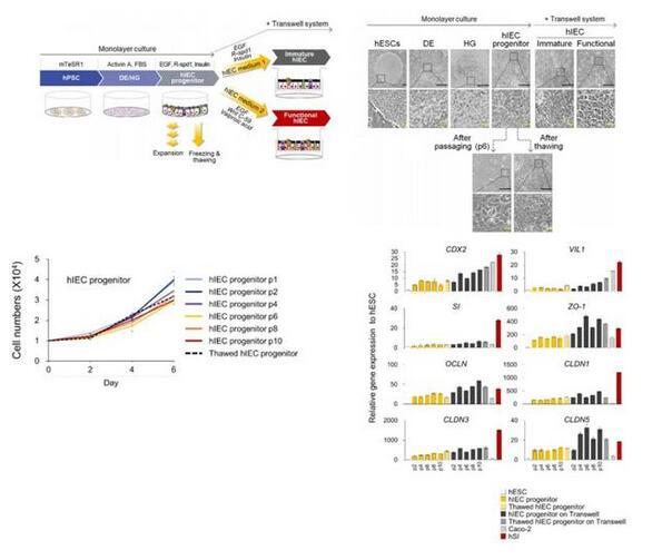 鑒于此,韓國(guó)生命工學(xué)研究院的一項(xiàng)研究開(kāi)發(fā)了一種重復(fù)性良好的兩步方法來(lái)誘導(dǎo)人多能干細(xì)胞分化為可擴(kuò)大的hIEC祖細(xì)胞和具有功能性的hIEC單層細(xì)胞。