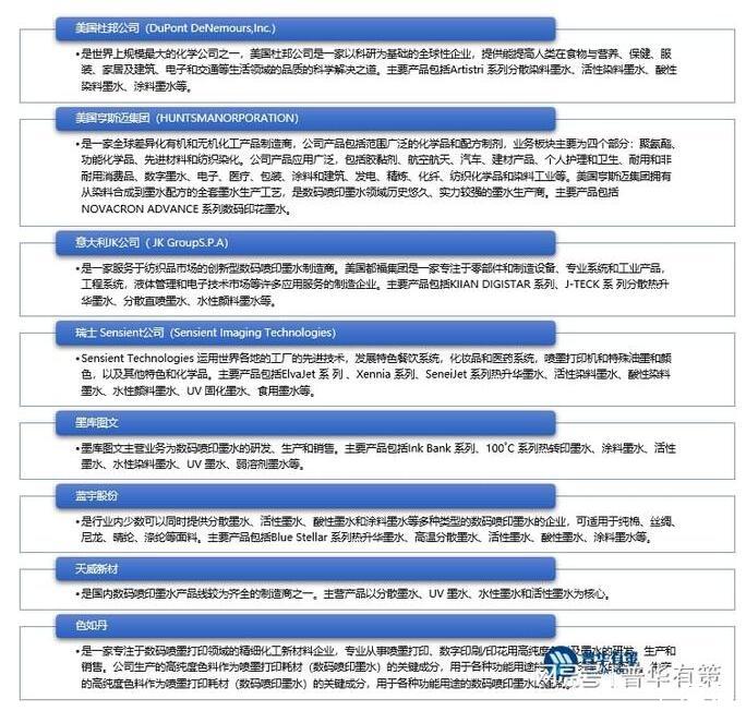 數(shù)碼噴印墨水市場呈現(xiàn)與數(shù)碼印花設(shè)備市場相近的市場競爭格局,由海外巨頭主導(dǎo)市場,如美國杜邦公司、美國亨斯邁集團、意大利JK公司等。從全球范圍來看,目前歐洲、北美地區(qū)的數(shù)碼噴印技術(shù)仍處于較高水平,是率先對數(shù)碼噴墨印花技術(shù)實現(xiàn)產(chǎn)業(yè)化的地區(qū),受益于較高的環(huán)保標(biāo)準(zhǔn)和豐富的時尚原創(chuàng)設(shè)計產(chǎn)業(yè),歐洲、北美地區(qū)的數(shù)碼印花產(chǎn)品供需旺盛,數(shù)碼噴印應(yīng)用產(chǎn)業(yè)規(guī)模大且普及程度高,全球領(lǐng)先的數(shù)碼噴印墨水制造商多集中于此,亞太地區(qū)則以日本、韓國制造商為主。我國的數(shù)碼噴印墨水行業(yè)起步較晚,企業(yè)規(guī)模、研發(fā)能力以及產(chǎn)品穩(wěn)定性等方面參差不齊,且主要以中小型企業(yè)為主,但隨著最近幾年國產(chǎn)數(shù)碼噴印墨水的快速發(fā)展,我國也出現(xiàn)了少數(shù)綜合實力相對較強的專業(yè)生產(chǎn)商。國內(nèi)外主要墨水生產(chǎn)商情況如下: