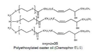 另一類重要的非離子表面活性劑是聚氧乙烯蓖麻油(Cremophor)或聚氧乙烯氫化蓖麻油(Cremophor RH)。蓖麻油是蓖麻油甘油三脂,與環氧乙烯反應,親水性的氧化乙烯結構便插入到蓖麻酸和甘油之間,便得到了聚氧乙烯蓖麻油,如果蓖麻油中的雙鍵加氫飽和后,再與環氧乙烯反應,那么得到的便是聚氧乙烯氫化蓖麻油。環氧乙烯和蓖麻油的反應位點是隨機的,因此得到的表面活性劑是一種混合物,也包括未反應的蓖麻油和均聚形成的聚氧乙烯。不同種類的聚氧乙烯蓖麻油或聚氧乙烯氫化蓖麻油是通過參與反應的氧化乙烯和蓖麻油或氫化蓖麻油的比例決定的,例如Cremophor EL 40或Cremophor RH 40,其中40代表的便是混合物中氧化乙烯和蓖麻油的摩爾比。這類表面活性劑的HLB一般在12以上,常用作難溶性藥物的增溶。