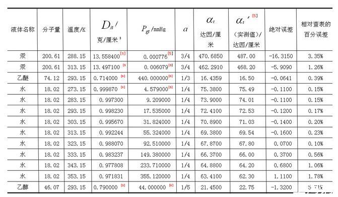 其中N0為阿伏伽德羅數,M為摩爾質量,Dit是液體的密度,Dgt是液體飽和蒸汽的密度,a為與液體種類相關的常量。為驗證(1)式的正確性,對汞、乙醚、水、乙醇等實際液態物質的表面張力系數進行理論計算,并與實驗實測值'相比較,列于下表【3】: