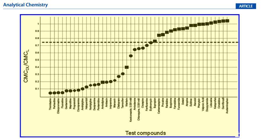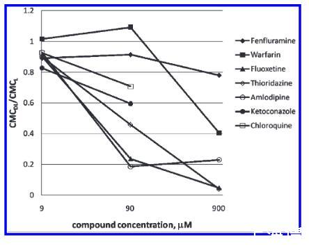 濃度依賴性。體內研究中PLD的程度是劑量依賴性的。24,33在體外試驗中,濃度控制可用于估計劑量依賴性。一組七種報告的PLD誘導劑分別以三種不同的濃度進行了測試:910、91和9.1μM(圖4)。對于氯喹和酮康唑,要么它們在10 mM時不能完全溶解在DMSO中,要么在使用10 mM DMSO儲備液時與緩沖液混合后鹽析出來,它們的最高濃度點被去除。所有化合物都表現出對CMC的濃度依賴性,以不同程度改變PLD誘導潛力。即使在910μM時,芬氟拉明似乎也是一種弱誘導劑,而硫利達嗪在不同濃度之間顯示出顯著變化。根據該體外數據,在9.1μM的最低濃度下,七種化合物中沒有一種似乎能夠誘導PLD。復合自聚合。與磷脂類似,大多數PLD誘導劑是兩親性的。盡管帶有不同的電荷跡象,但它們也可以聚集并形成膠束。拉貝洛爾20,34和奎尼丁35被報道為PLD誘導劑;然而,在所應用的測試條件下,我們無法確定任何一種藥物脂質復合物的CMC。獲得的RFU值等于或低于空白(含熒光探針但不含脂質的化合物)中的值。進一步研究了不同藥物濃度但沒有脂質(0 mg/mL脂質),并且在無脂質測定緩沖液中,拉貝洛爾和奎寧的CMC值分別為26和20μM。這些CMC值遠低于這些化合物在PLD篩選中的測試濃度,并且懷疑化合物的自聚集會干擾藥物脂質復合物形成的檢測,從而使CMCDL無法確定。