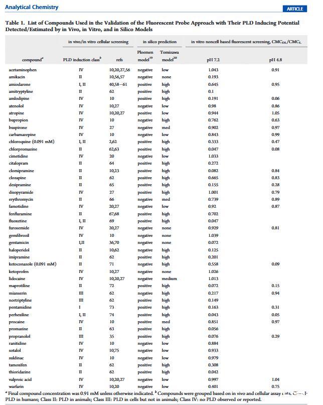 測定pH影響。PLD中的脂質紊亂主要在構成酸性的溶酶體區室中觀察到環境。為了模擬溶酶體條件,pH 4.8醋酸鹽在PLD篩選研究中使用緩沖液,25種進行研究使用上述相同的程序商業化合物(表1)對。大多數化合物在結果相似兩種緩沖液中的;然而,胺碘酮、氯米帕明、米安色林和華法林給出了截然不同的數據,將前三種化合物從PLD誘導劑轉移到非誘導劑,將華法林劑轉移從非誘導到誘導劑,從pH 7.2到pH 4.8。