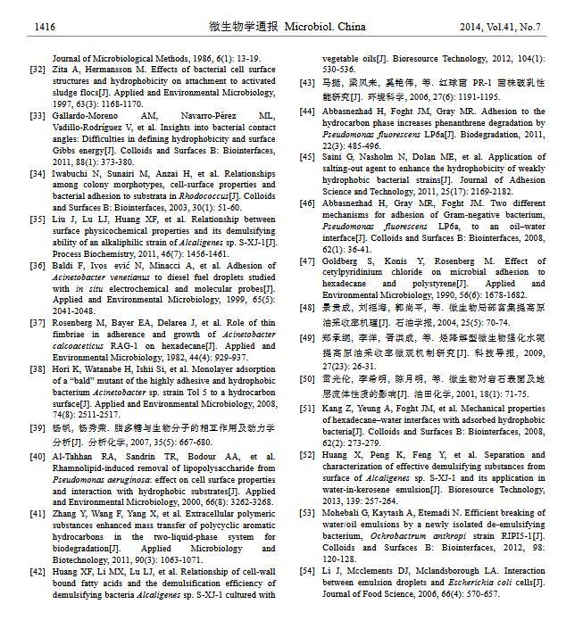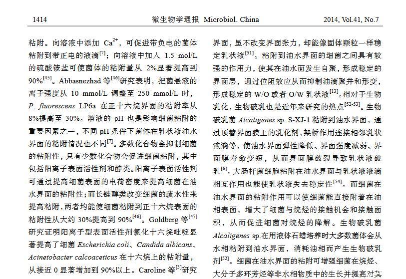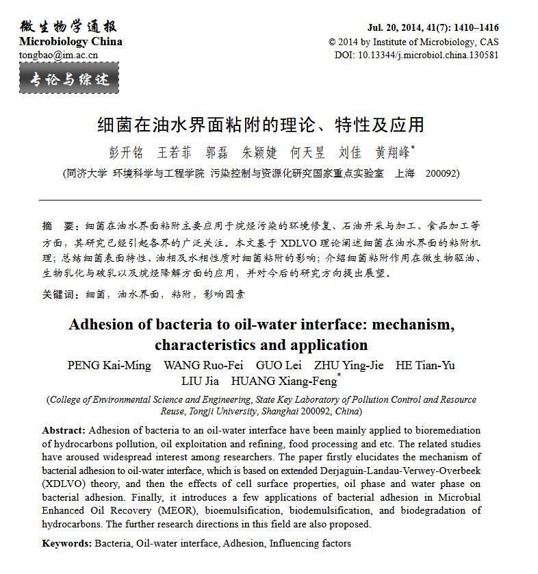 摘 要:細菌在油水界面粘附主要應用于烷烴污染的環境修復、石油開采與加工、食品加工等方面,其研究已經引起各界的廣泛關注。本文基于 XDLVO 理論闡述細菌在油水界面的粘附機理;總結細菌表面特性、油相及水相性質對細菌粘附的影響;介紹細菌粘附作用在微生物驅油、生物乳化與破乳以及烷烴降解方面的應用,并對今后的研究方向提出展望。