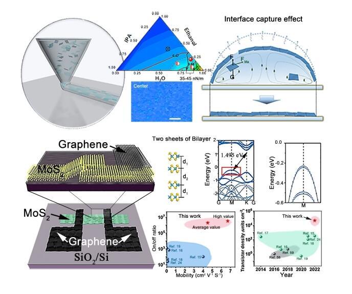二維(2D)半導(dǎo)體材料為將摩爾定律擴展到原子尺度提供了機會。與傳統(tǒng)基于蒸鍍和光刻技術(shù)的加工技術(shù)相比,印刷電子因成本效益、靈活性以及與不同襯底的兼容性而受到關(guān)注。目前,印刷的二維晶體管受到性能不理想、半導(dǎo)體層較厚和器件密度低的制約。同時,多數(shù)二維材料油墨通常使用高沸點溶劑,隨之而來的問題包括器件性能退化、高材料成本和毒害性等,難以大規(guī)模應(yīng)用。因此,發(fā)展簡單且環(huán)保的策略對于制造低成本、大規(guī)模的打印二維材料功能器件具有重要意義。