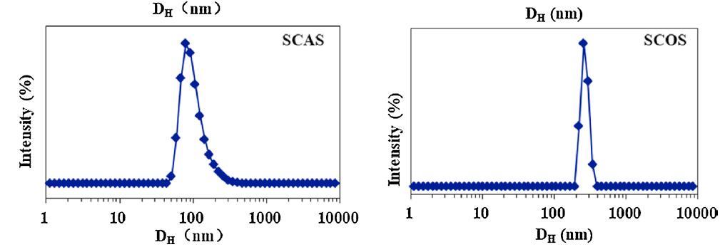 用DLS測量在6種酰基氨基酸表面活性劑水溶液中形成的聚集體的大小和分布,其CMC為5倍,5×CMC。圖2顯示了它們的表觀等效流體動力學直徑(DH)。除絲氨酸外,蓖麻油表面活性劑的DH分布普遍大于棉籽油表面活性劑的DH分布。SCAG和SCAA的DH分布分別集中在900和150 nm,而SCOG和SCOA聚集體的直徑約為10 nm。對于絲氨酸,SCAS和SCOS的平均DH值分別約為100 nm和250 nm。這些結果可以通過蓖麻油衍生的表面活性劑的蓖麻油基和絲氨酸頭部基團上都存在-OH基團來解釋,促進了大聚集體,例如囊泡的形成(圖2)。