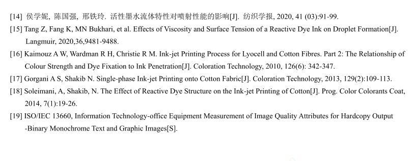 【摘要】:為了研究活性染料墨水黏度和表面張力對(duì)棉織物印花性能的影響,配制不同黏度和表面張力的活性紅墨水,測(cè)試打印后織物的滲透率、K/S值、墨量及打印線寬等指標(biāo)。結(jié)果表明:提高墨水黏度會(huì)降低墨滴在織物上的潤(rùn)濕和滲透性能,打印到織物的墨量減少,打印清晰度下降。不同黏度的墨水對(duì)打印線條經(jīng)緯向的清晰度影響機(jī)制不同,表面張力對(duì)織物打印性能的影響比黏度小。
