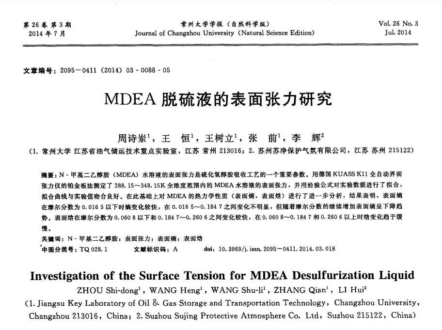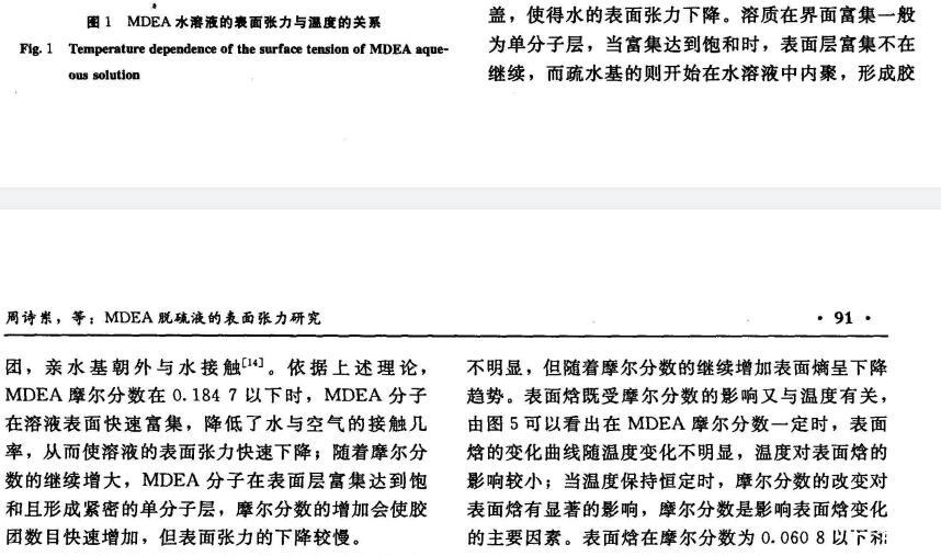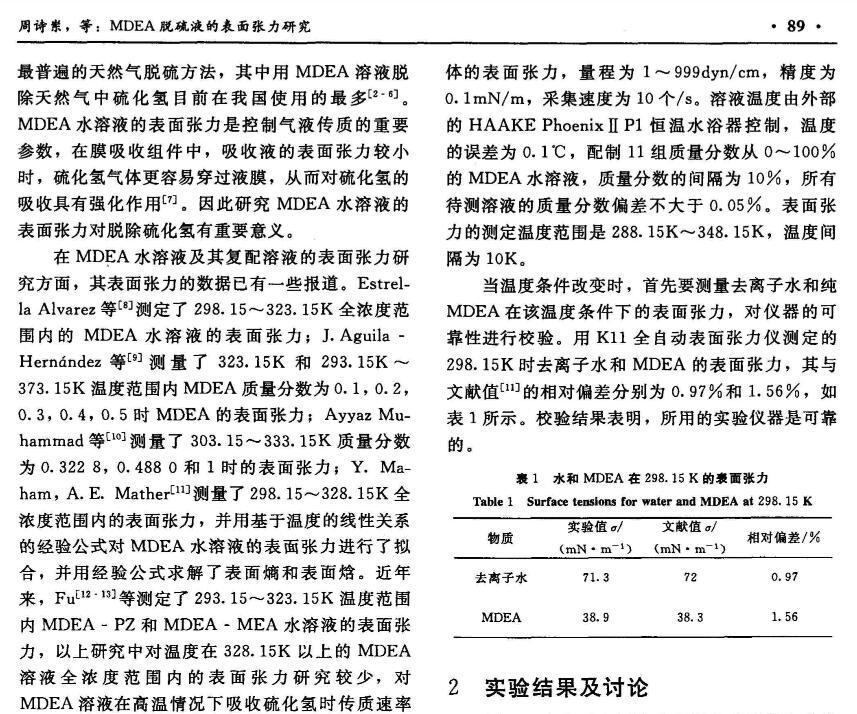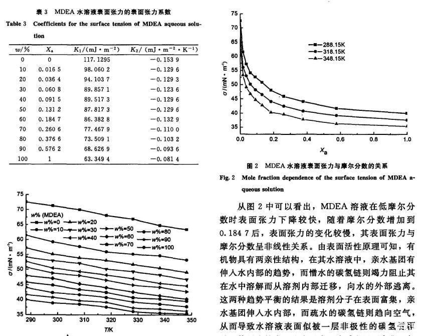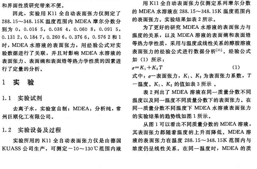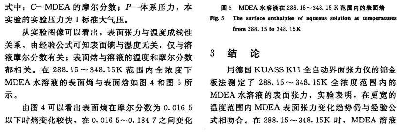 【摘要】:N-甲基二乙醇胺(MDEA)水溶液的表面張力是硫化氫醇胺吸收工藝的一個重要參數。用德國KUASS K11全自動界面張力儀的鉑金板法測定了288.15~348.15K全濃度范圍內的MDEA水溶液的表面張力,并用經驗公式對實驗數據進行了擬合,擬合曲線與實驗值吻合良好。在此基礎上對MDEA的熱力學性質(表面熵,表面焓)進行了進一步分析,結果表明,表面熵在摩爾分數為0.016 5以下時熵變化較快,在0.016 5~0.184 7之間變化不明顯,但隨著摩爾分數的繼續增加表面熵呈下降趨勢。表面焓在摩爾分數為0.060 8以下和0.184 7~0.260 6之間變化較快,在0.060 8~0.184 7和0.260 6以上時焓變化趨于緩慢。
