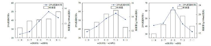 實驗測得SLES,SDS,APG和BS在w=0.2%時的25%析液時間依次為33,30,21和25 s,100 mL泡沫析液量依次為15.97,12.92,13.69和10.89 g。由圖4可知,SLES/SDS無明顯增效,隨著SLES質量分數的增加,復配組分的析液量和25%析液時間接近SLES單組分。SLES/APG的25%析液時間增加,泡沫穩定性較好,其中w(SLES):w(APG)=7:3的25%析液時間、100 mL泡沫析液量依次為58 s、14.92 g。SLES/BS的析液量和泡沫穩定性均有所提升,其中w(SLES):w(BS)=5:5的25%析液時間、100 mL泡沫析液量依次為64 s、21.95 g。